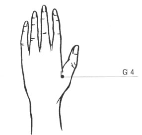 電磁リフレクソロジーバイオコレクターのチタン製球状マッサージアダプターを使用してVB9(聴会)(訳注-番号からは該当する経穴はない、原文の音と図の場所から名称を決定した),E6(頬車),E7(上関)(番号からは曲びんだが原文の音と図より名称を決定した)(図1.18)の各2点を30秒ずつ軽くマッサージしていきます。このマッサージの最後には20秒間やや強めのマッサージを行います。GI4(合谷、図1.19)を1秒おきに指圧します。その後、電磁リフレクソロジーの肩こりバイオコレクターカプセル(チタン製)を、首やあごなど痛みのある個所に固定します。